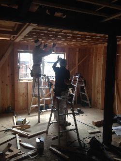 天井、壁、床すべて新設しました。ユニットバスの組み立て模様です。隣の部屋のユニットバスが奥に見えますね。2台同時に組み立てました。