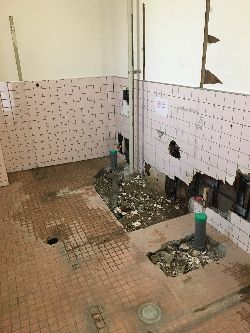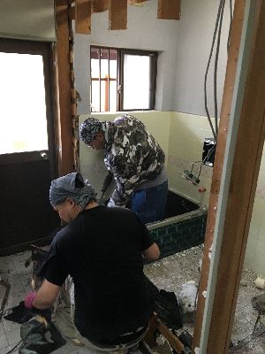 タイル貼りのパネルが重くて搬出が大変だと思っていたら、パネルをハンマーでたたき割り、フレームだけにして搬出。