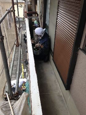 軒天の塗りにくいところを先に、丁寧に塗っていきます。