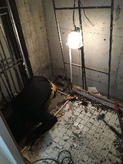タイル貼りのパネルが重くて搬出が大変だと思っていたら、パネルをハンマーでたたき割り、フレームだけにして搬出。