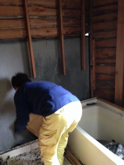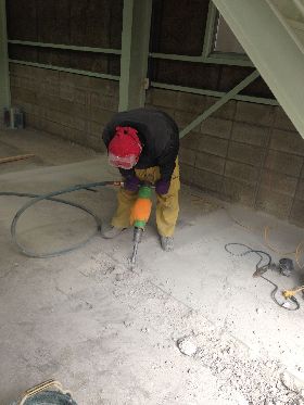 まずは倉庫内の土間をハツって配管していきます。配管経路を溝斫りし、排水配管をします。